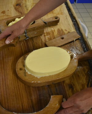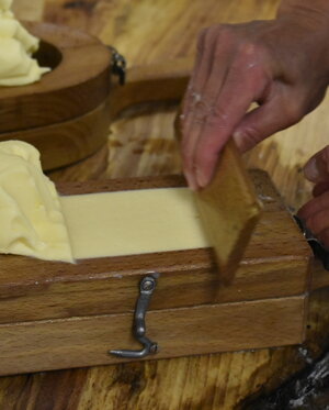 Divisa la "pagnotta" in parti più piccole e deposte nelle apposite formine in legno il burro, mediante una lieve pressione, prende forma; segue qualche ora in acqua fredda per poi passare al confezionamento.